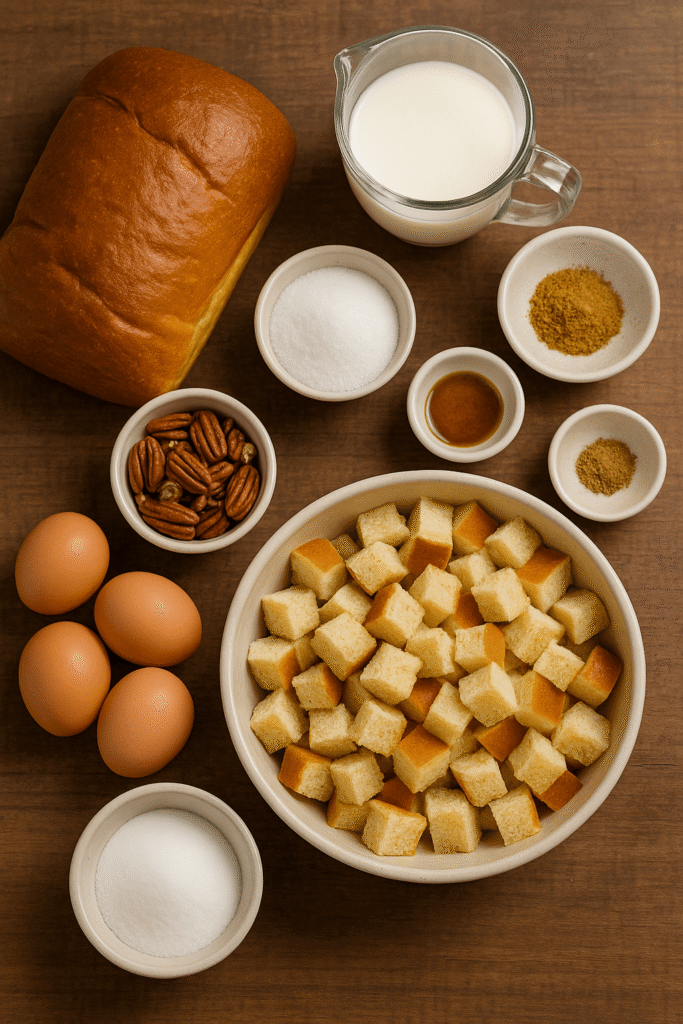 • 1 loaf of day-old brioche, challah, or French bread (about 6–7 cups cubed)