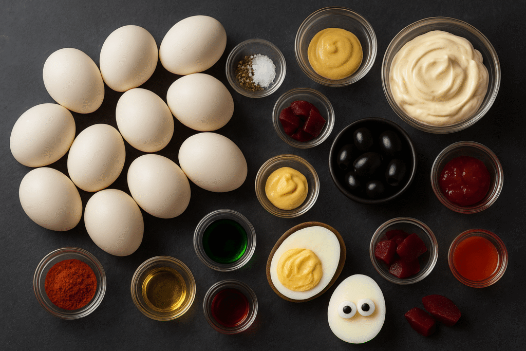Pro Tip: If serving to kids, keep it fun but not too scary. Mummy eggs and pumpkin eggs are adorable. For adults, you can go creepier with “bloody” designs and spider toppings.