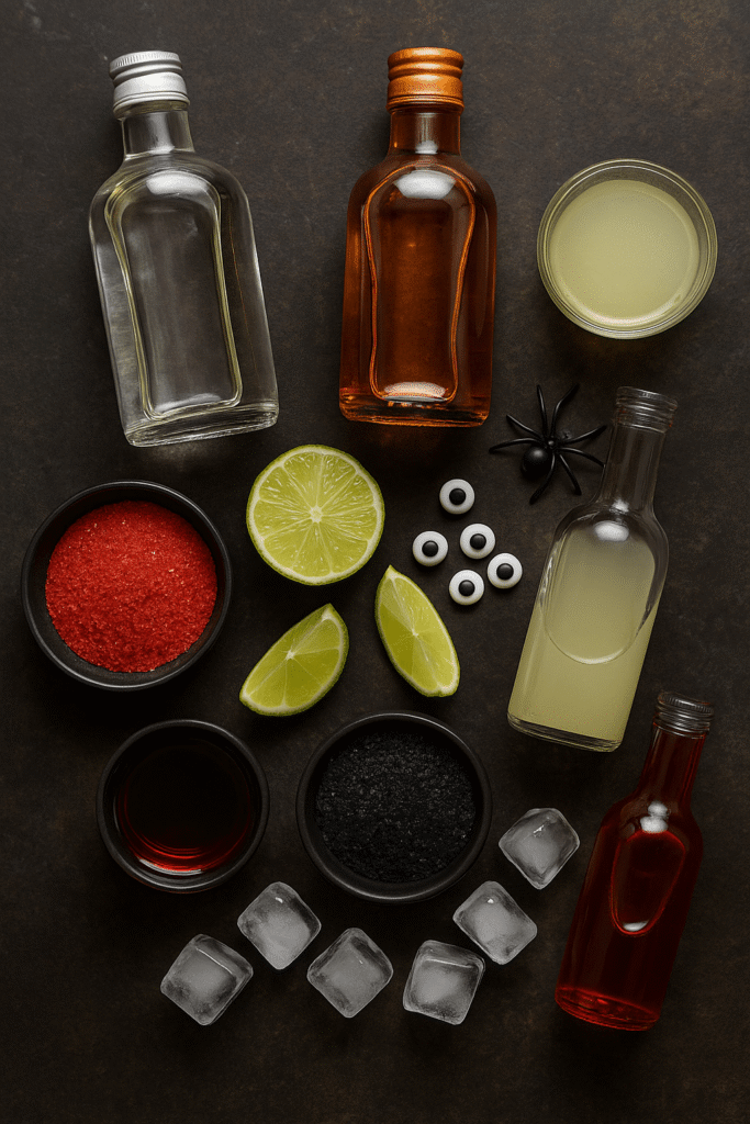 • Garnishes: lime wedges, candy eyeballs, or fake plastic spiders for presentation