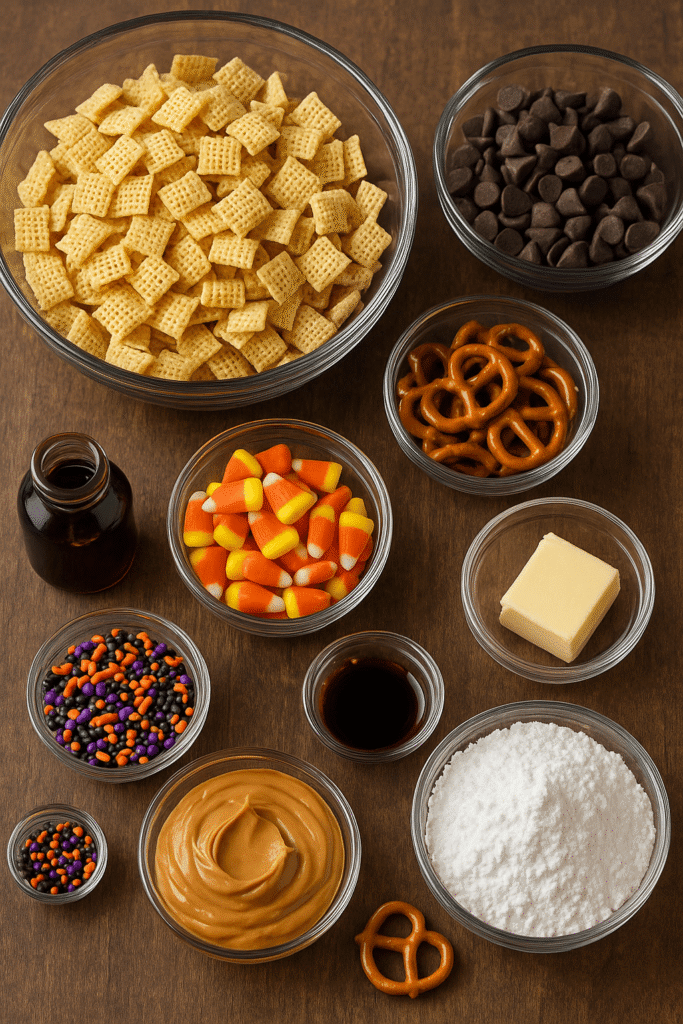 A spooky twist on the classic muddy buddies snack mix! Chex cereal is coated in chocolate, peanut butter, and powdered sugar, then tossed with candy corn, pretzels, and Halloween sprinkles for a festive party treat.