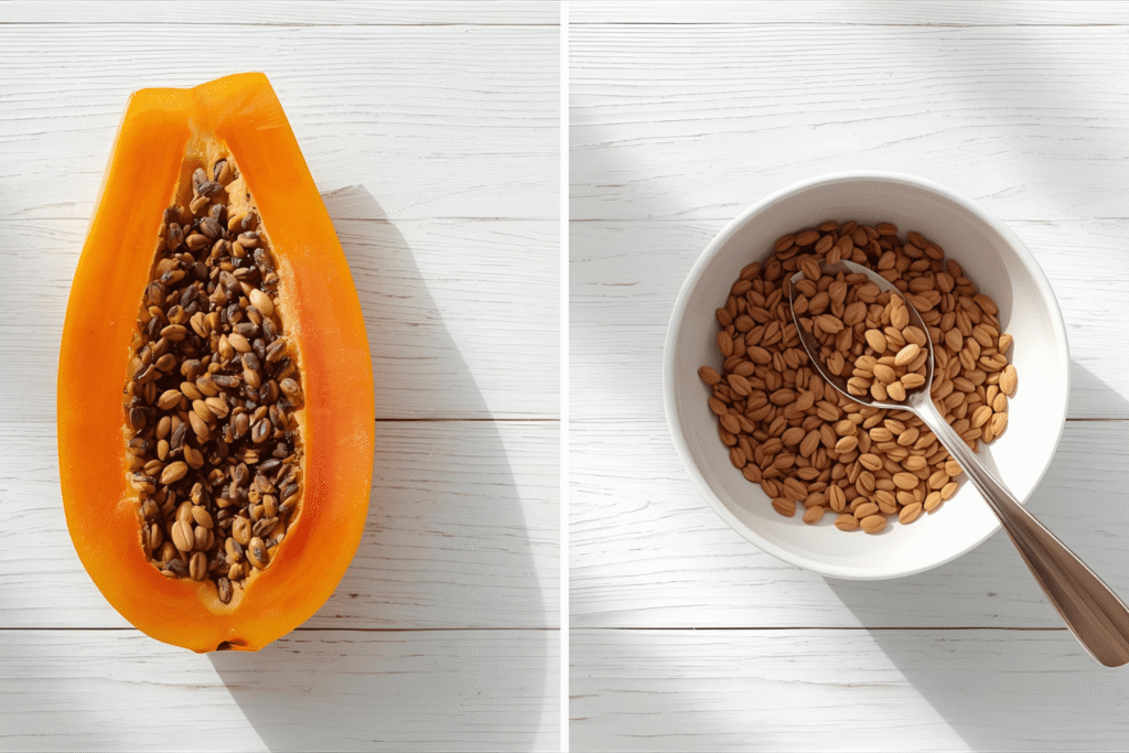 Papaya seeds are rich in fiber, healthy fats, polyphenols, and plant compounds that support better digestion and internal cleansing. Some small studies even suggest that papaya seeds may help maintain a balanced gut environment.