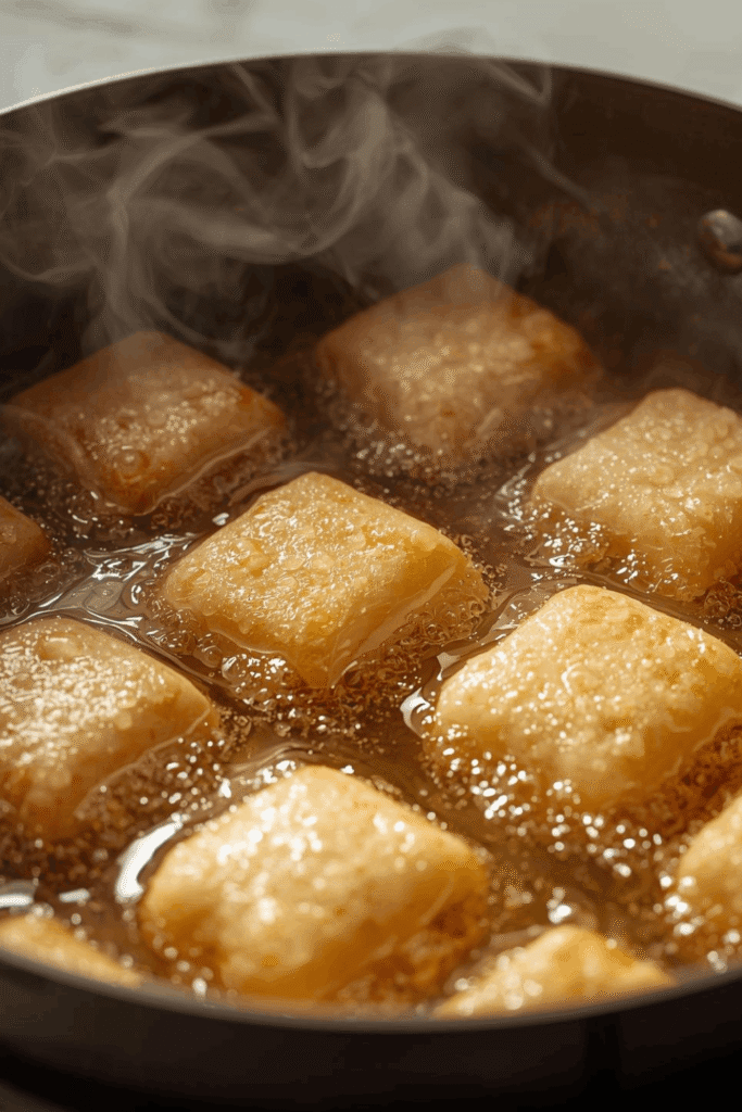 Fry 2–3 pieces at a time for about 60–90 seconds per side until golden brown and puffed.