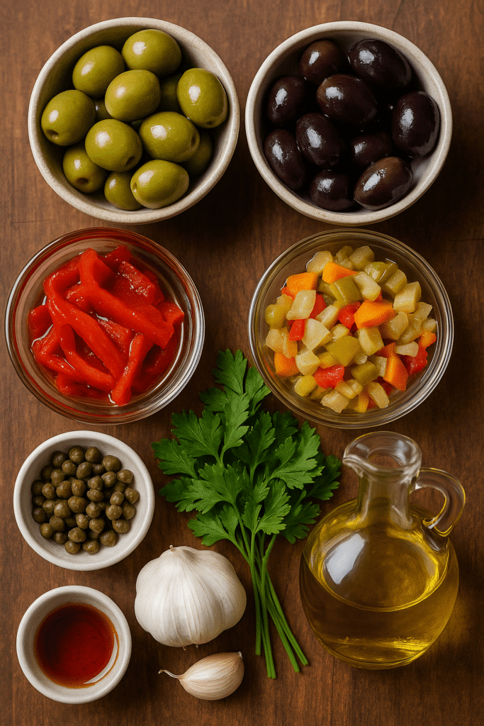 - Olives – a mix of green (like Castelvetrano) for buttery notes and Kalamata for depth.