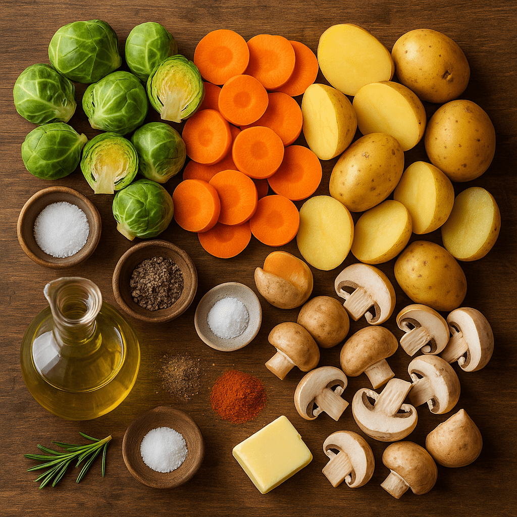 Halve the Brussels sprouts, slice the carrots, halve the baby potatoes, and cut the mushrooms. Spread them out on a large baking tray. - Season generously